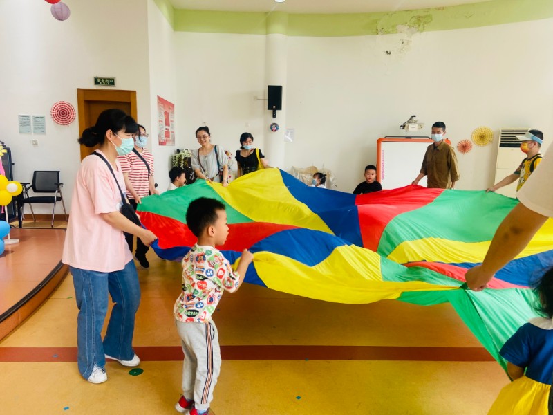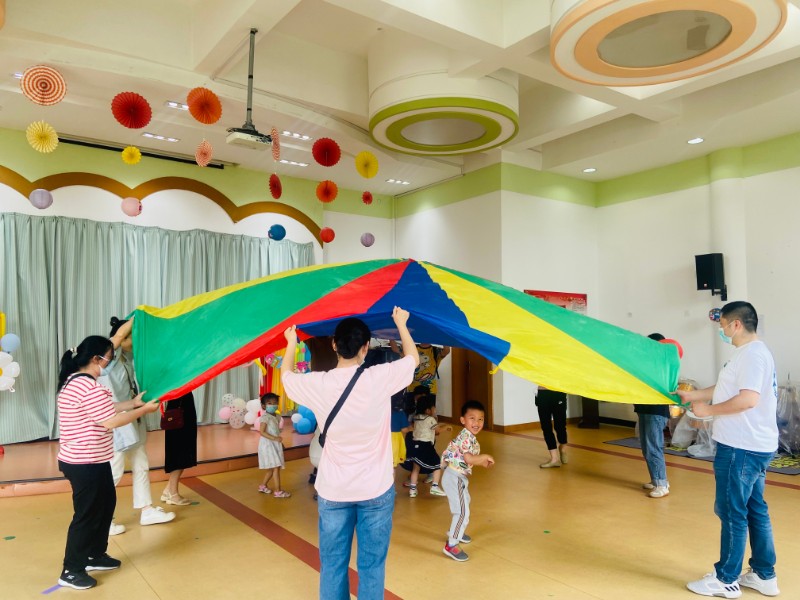 小朋友们做一做小兔子,有趣的情境让孩子感受彩虹伞的乐趣。