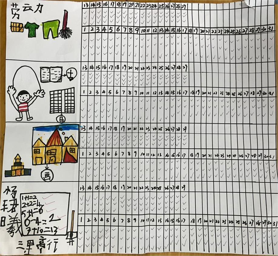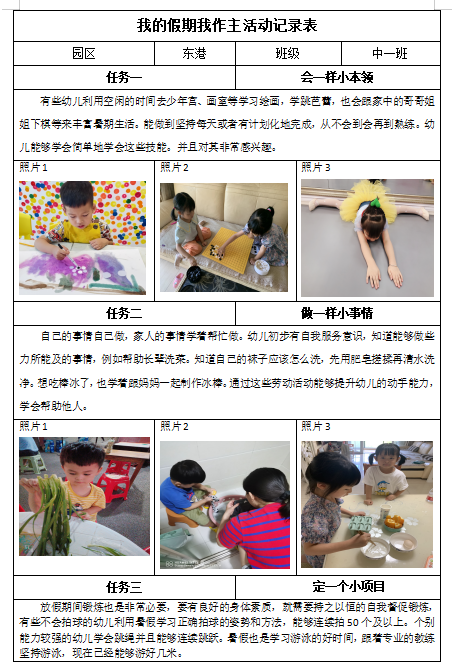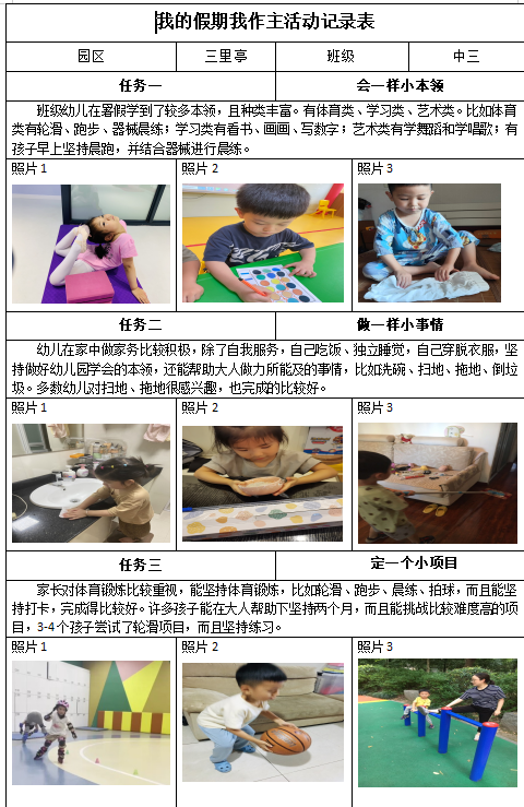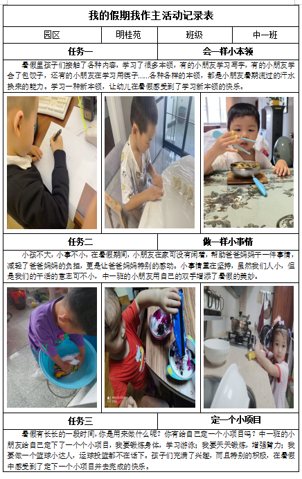 假期是充实自己,学习新事物的好时机。为此,在家长们的陪伴、鼓励、引导下,中班的孩子们自主制定了“三·一”小任务,即会一样小本领、做一件小事情、定一个小项目,一起来看看在假期里,孩子们都解锁了哪些新技能吧!