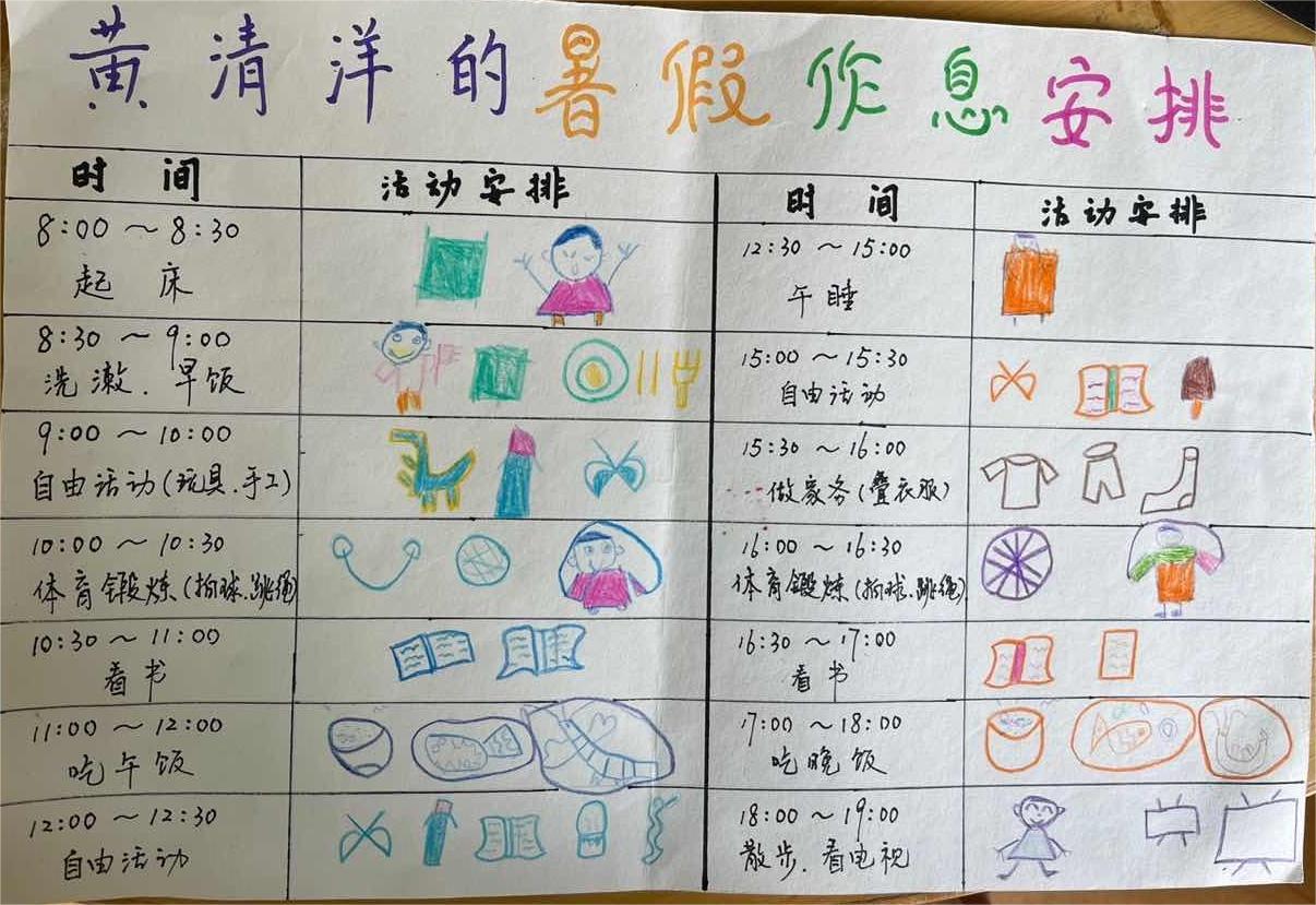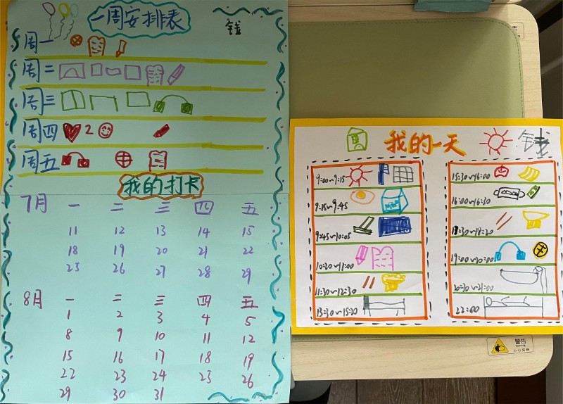 瞧!孩子们制作的暑期一日作息计划表和周计划有时间、有学习内容、有休息游戏时间,可谓劳逸结合,学习享受两不误呀!
