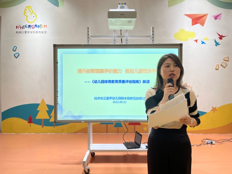 随着对《幼儿园保育教育质量评估指南》的深入学习,为了更有效解读《评估指南》,进一步探讨活动中有效的教育过程方式,探寻有力的教育过程策略,杭州市三里亭幼儿园各年级组,重点对《评估指南》中三个关键点下的“家园共育”“活动组织”“师幼互动”,进行自主游戏观察的深度解读、互动研讨。