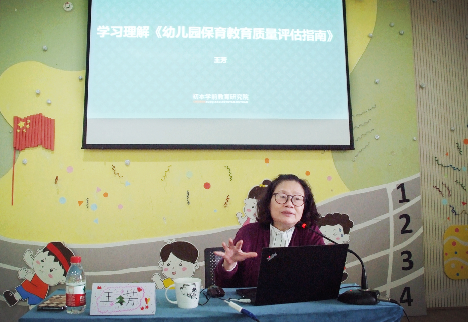 活动中,王芳老师对《幼儿园保育教育质量评估指南》的5个重点板块、15项关键指标和48条考察要点进行了深入剖析,并梳理出了重点评估内容。其中,王芳老师聚焦自主游戏,特别指出敏感性、真游戏、直接经验三个关键词,儿童的学习应该是解决问题式的深度学习而不是浮于表面的被动学习,希望老师们在观察儿童游戏时,改变原有的固有观念,在此基础上助推儿童直接经验的获得。在落实《幼儿园保育教育质量评估指南》的过程中,学会思考、勇于实践、不断反思,正确理解指标、考察点的逻辑关系,回归真游戏,全面推动幼儿教育的科学、高质量发展。