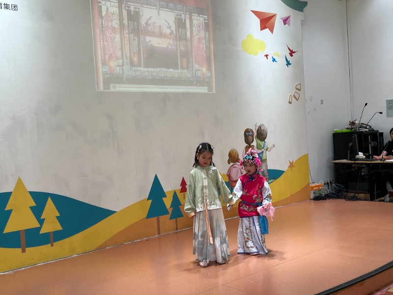 中班小朋友带来的京剧课程展示改编自京剧选段《卖水》《这一封书信来得巧》,云肩、盔头、胡子、靠旗等道具都是来源于孩子们的巧手。